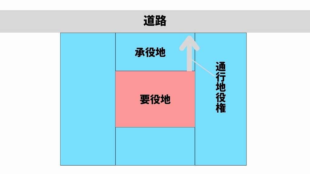 承役地(しょうえきち)とは、他人に通行させる義務を負う側の土地のことです。公道に面した手前の土地が承役地になることが多く、この土地の所有者は通行を拒否することができません。