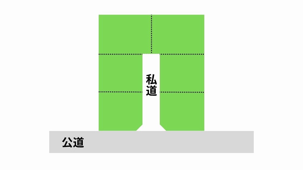 ミニ開発では、土地を効率よく分割するために、道路までの通路が細長い「旗竿地(はたざおち)」が多く見られます。